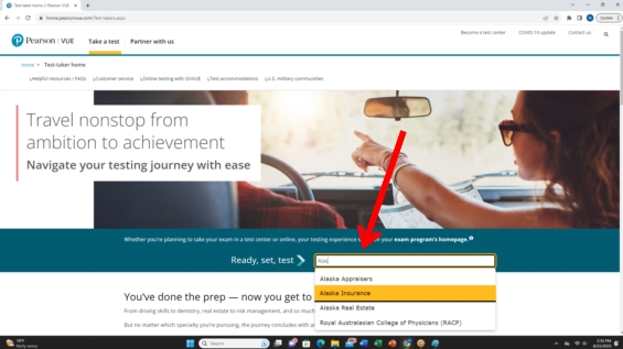 Step 1. From the Pearson VUE home page start typing "Alaska" in the search field and select "Alaska Insurance" from the auto populated dropdown.