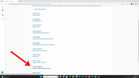Step 5. Select the exam for the insurance license you have prepared for. In this screen shot, we are selecting "InsAK_Health02, Alaska Accident and Health Insurance"